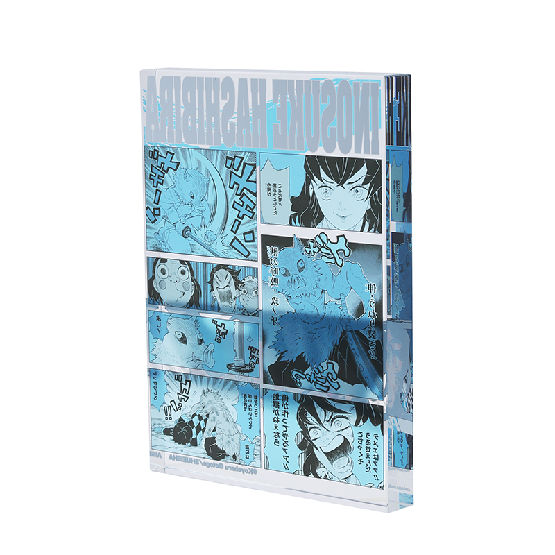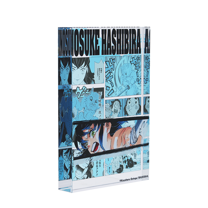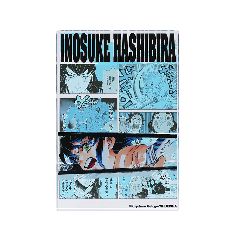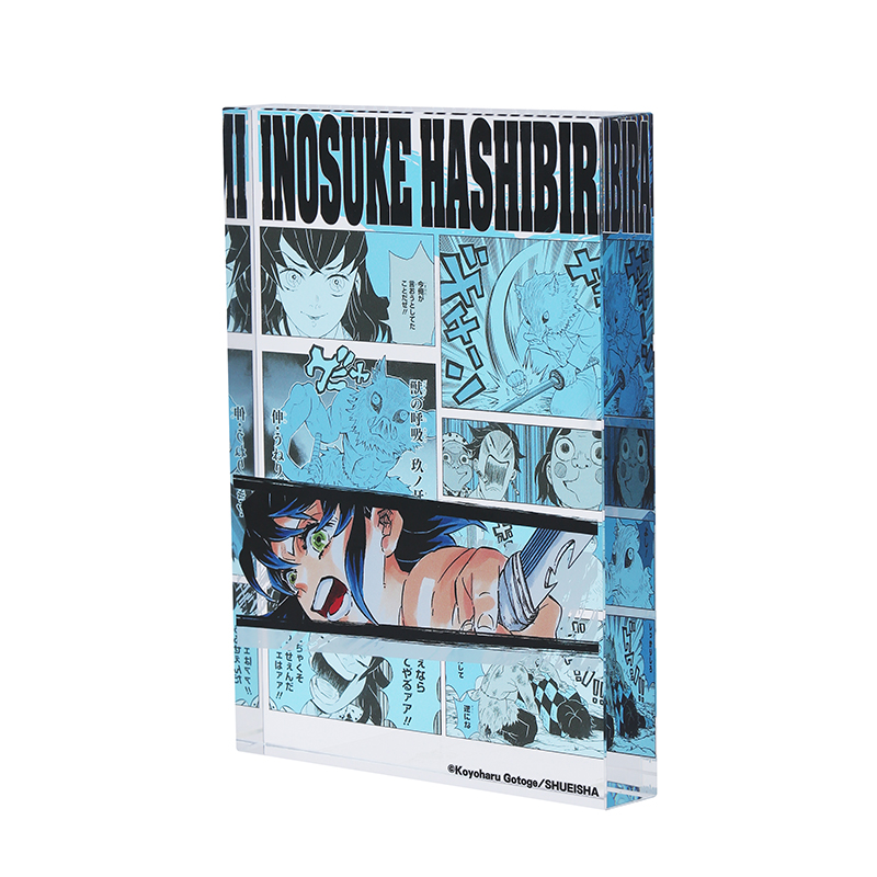 『鬼滅の刃』嘴平伊之助のアクリルブロック!厚さ20mmのアクリルは存在感MAX!!嘴平伊之助のかっこいいカラーカットの背面には、名シーンのコマが散りばめられているぞ。インテリアにぴったり!