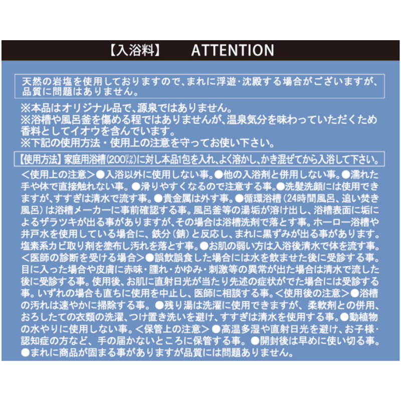 入浴剤:硫酸Na、塩化Na、炭酸水素Na、炭酸Na、チオ硫酸Na、赤106、黄5、青1
