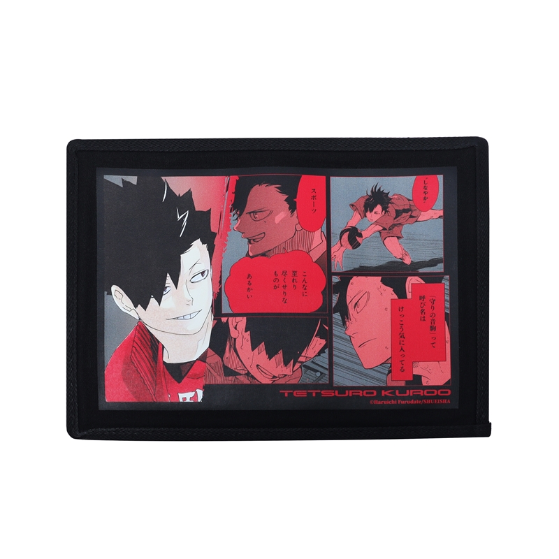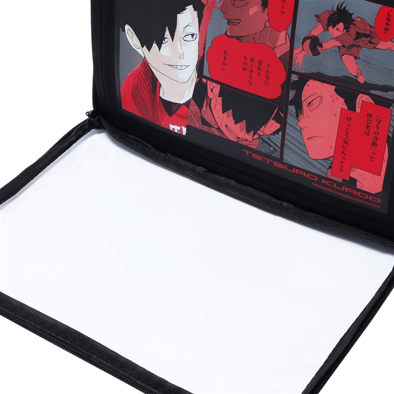 さらに、前面のファスナーを開けると、黒尾鉄朗のカラーイラスト&名場面がプリントされた特製ボードが付いてるぞ!ボードの裏面にはメッシュ生地が貼られていて、缶バッジやチャームなどを付けてカスタマイズも自由自在♪