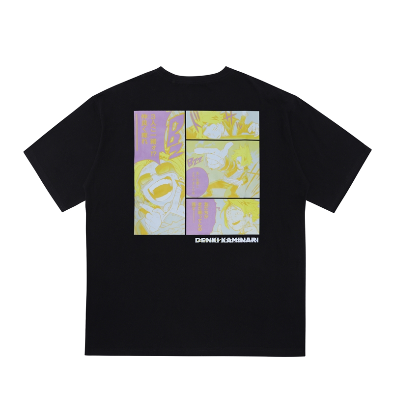 前面はミニポケット&キャラクターイラストがワンポイントで付いたシンプルなデザイン、背面には上鳴電気の名場面が大胆にデザイン!