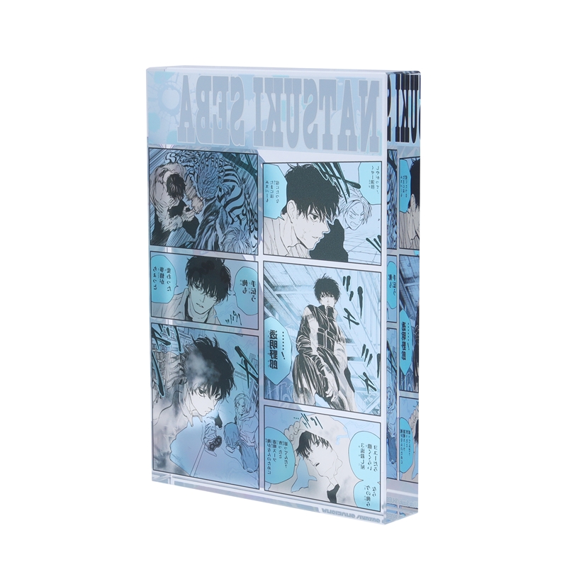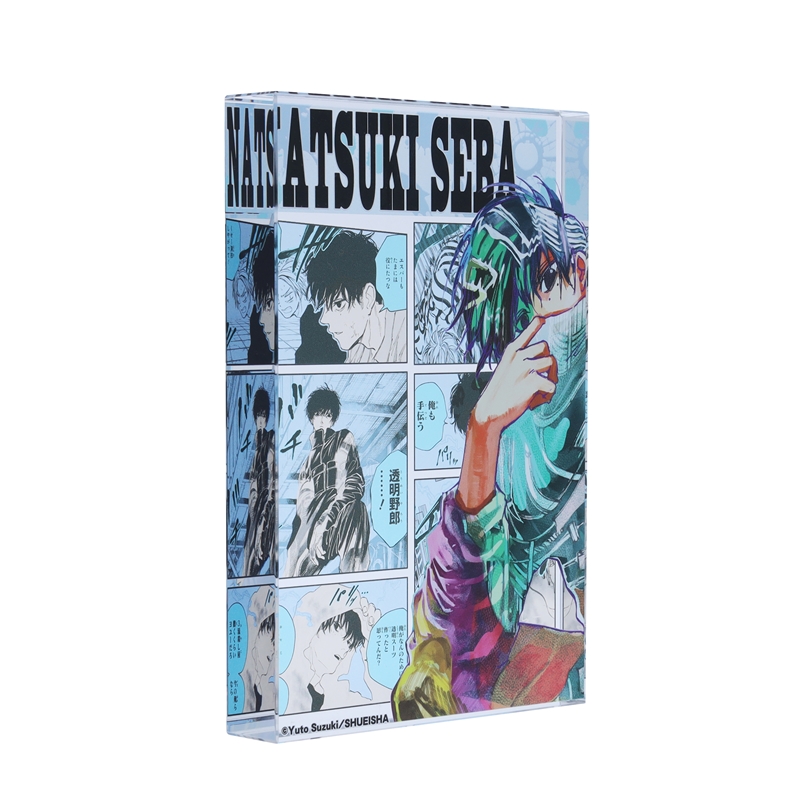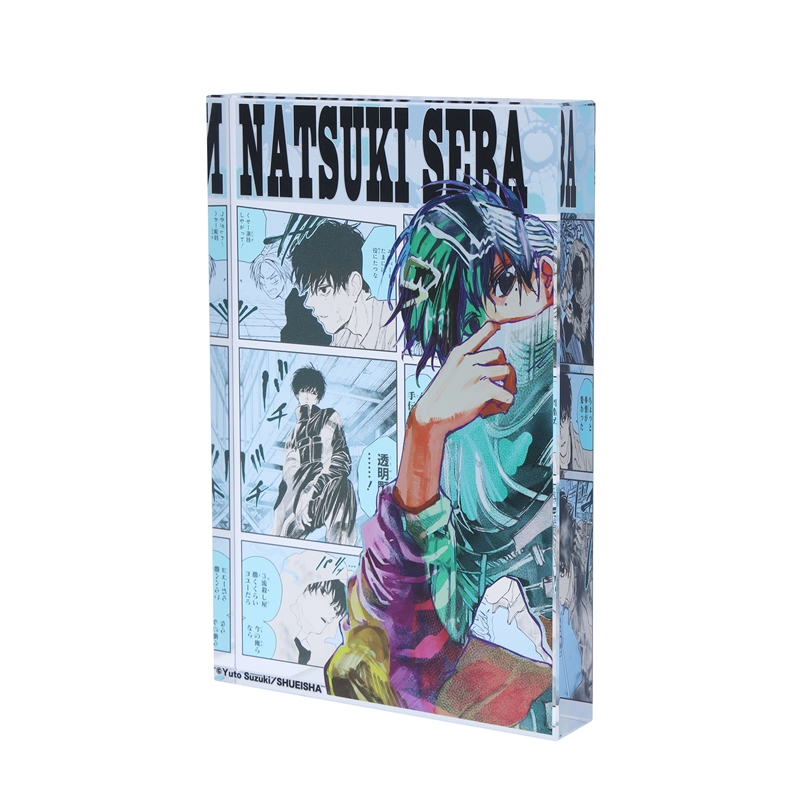 『SAKAMOTO DAYS』勢羽夏生のアクリルブロック!厚さ20mmのアクリルは存在感MAX!!勢羽夏生のかっこいいカラーカットの背面には、名シーンのコマが散りばめられているぞ。インテリアにぴったり!