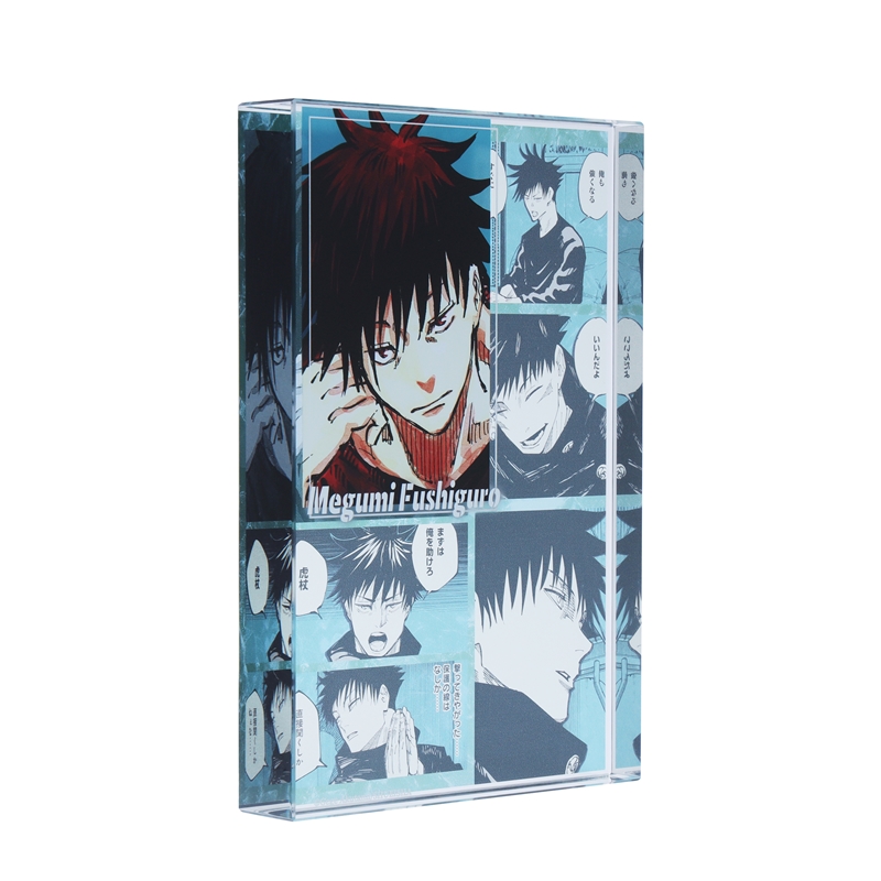 『呪術廻戦』伏黒恵のアクリルブロック!厚さ20mmのアクリルは存在感MAX!!伏黒恵のかっこいいカラーカットの背面には、名シーンのコマが散りばめられているぞ。インテリアにぴったり!