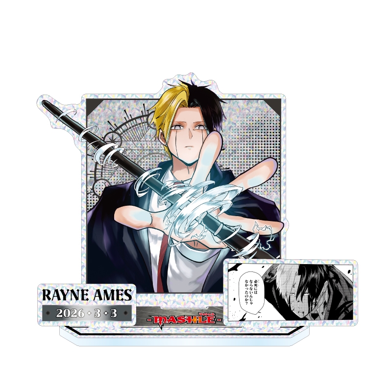 レイン・エイムズのカラーイラスト+名前&誕生日+作中の名場面のコマイラストのパーツが立体的に組みあがった、アクリルジオラマフィギュア!